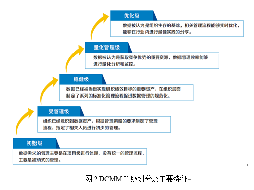 DCMM將數據管理能力成熟度劃分為五個等級,自低向高依次為初始級、受管理級、穩健級、量化管理級和優化級,不同等級代表企業數據管理和應用的成熟度水平不同。