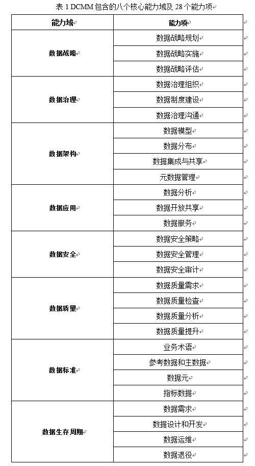 DCMM數據管理能力成熟度評估模型定義了數據戰略、數據治理、數據架構、數據應用、數據安全、數據質量、數據標準和數據生存周期八個核心能力域及28個能力項,并以組織、制度、流程和技術作為八個核心域評價維度。