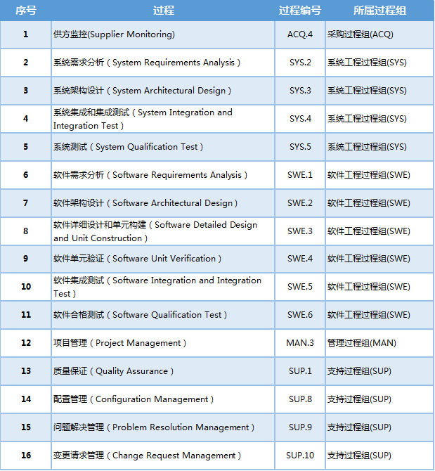 在實施ASPICE過程中,并非32個過程均需要實施,通常根據廠商的要求選擇過程實施,在ASPICE 3.1版本中,模型情況下,實施VDA范圍的16個過程,如下表: